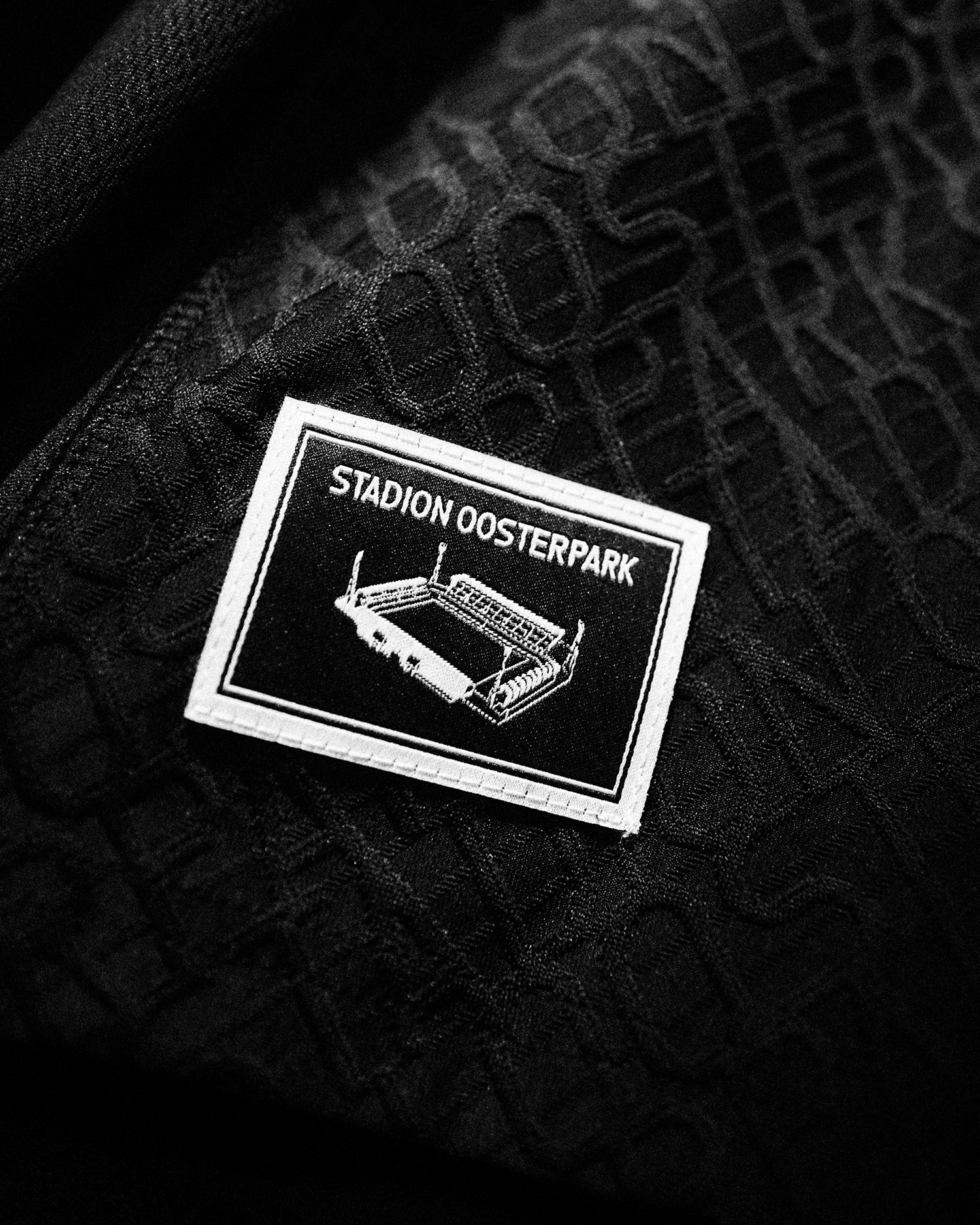 In 2025 it was 20 years since FC Groningen last played in the old Oosterpark Stadium. To mark that milestone I designed a third shirt that pays tribute to the club’s former home. The shirt is full of details rooted in the club’s old home: a traditional cut, woven Oosterpark lettering, and collar and cuff patterns inspired by the steel bars of the original stadium sign. On that design foundation, we built a campaign that connects past and present through raw, early-2000s-styled black-and-white imagery featuring current players, club legends and local youth.